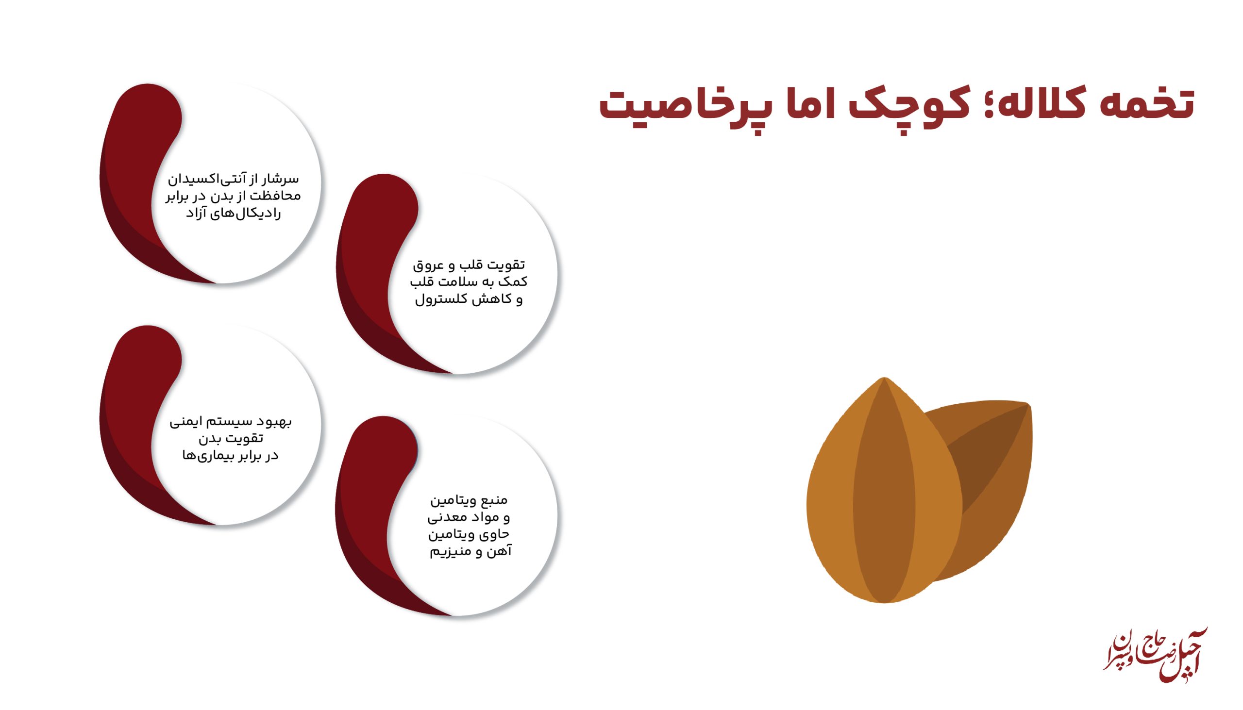تخمه کلاله سفید نمکی | حفظ سلامت قلب، کاهش فشار خون | پتاسیم، آهن، ویتامین B6 | افراد با فشار خون بالا، رژیم کمنمک |