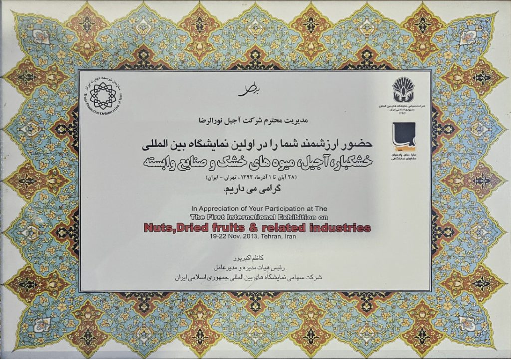 از جلوه های فعالیت مجموعه در سال 1392، حضور در اولین نمایشگاه بین المللی خشکبار، آجیل، میوه های خشک و صنایع وابسته بود که در تهران برگزار شد.