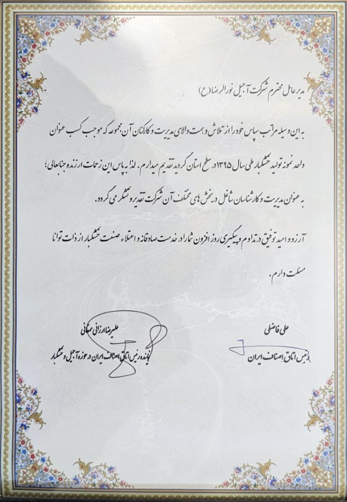 در سال 1395، تولید و پخش آجیل نور الرضا ( رضا آجیل چی مشهدی ) از سوی نماینده رئیس اتاق اصناف ایران در حوزه آجیل و خکشبار به عنوان واحد نمونه تولیدی انتخاب شد.