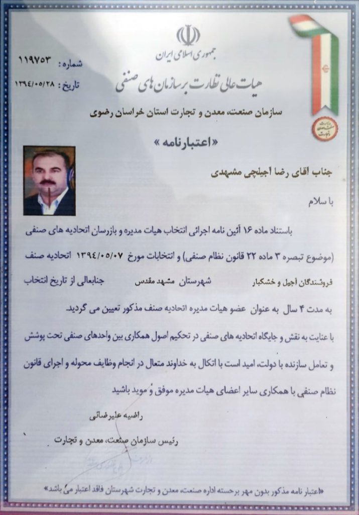 رضا آجیل چی مشهدی در سال 1394 به استناد ماده 16 آئین نامه اجرایی انتخاب هیئت مدیره و بازرسان اتحادیه های صنفی و انتخابات مورخ 7 مرداد ماه 1394 اتحادیه صنف فروشندگان آجیل و خشکبار شهرستان مشهد به عنوان عضو هیئت مدیره اتحادیه فروشندگان آجیل و خشکبار انتخاب شد.