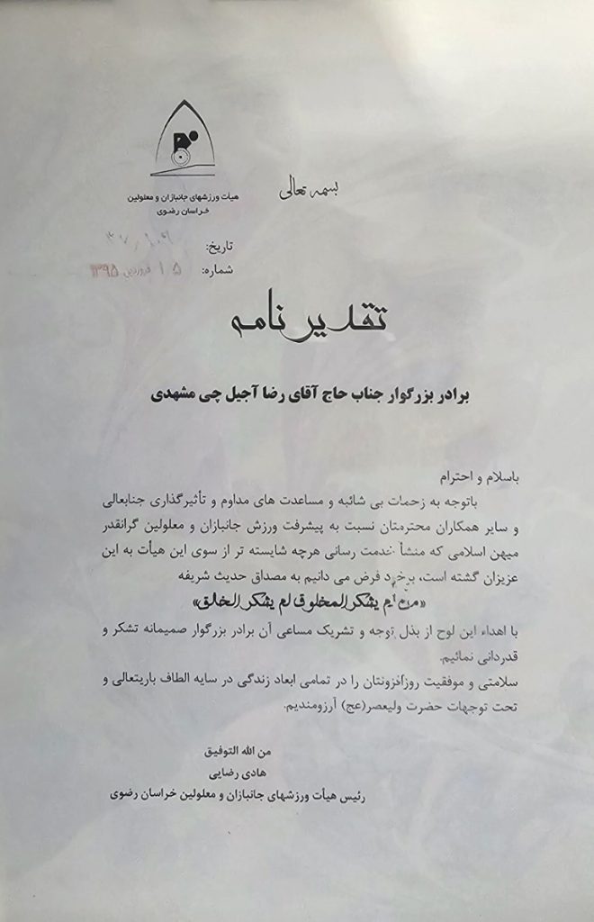 همچنین مجموعه در همان سال به واسطه دغدغه مندی و کمک های مجموعه در حوزه ورزش معلولین و جانبازان، از سوی رئیس هیئت ورزش های جانبازان و معلولین استان مورد تقدیر قرار گرفت.